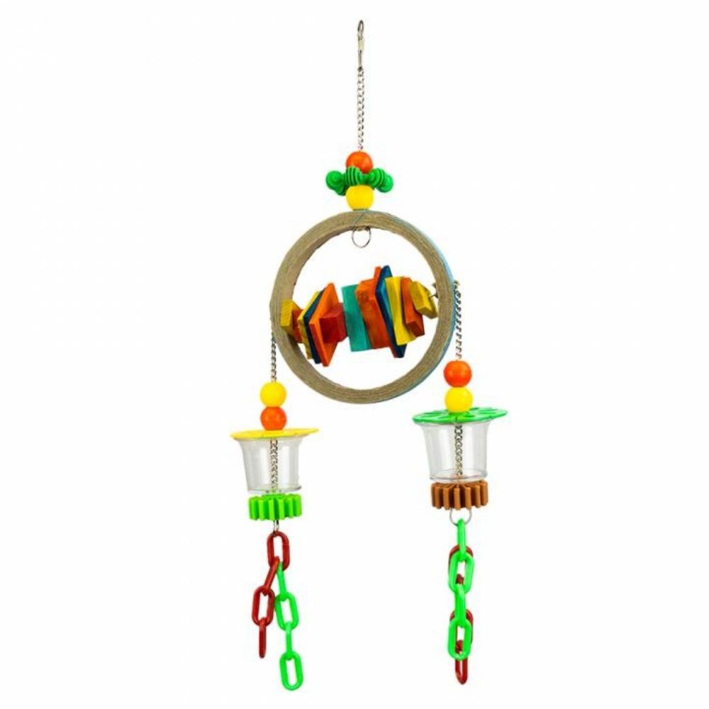 Este divertido juguete tiene doble función: por un lado cuenta con dos vasitos de forrajeo ideales para ofrecer el alimento de una forma mucho mas entretenida, por otro tiene varias piezas naturales para destruir como madera, cartón, etc.