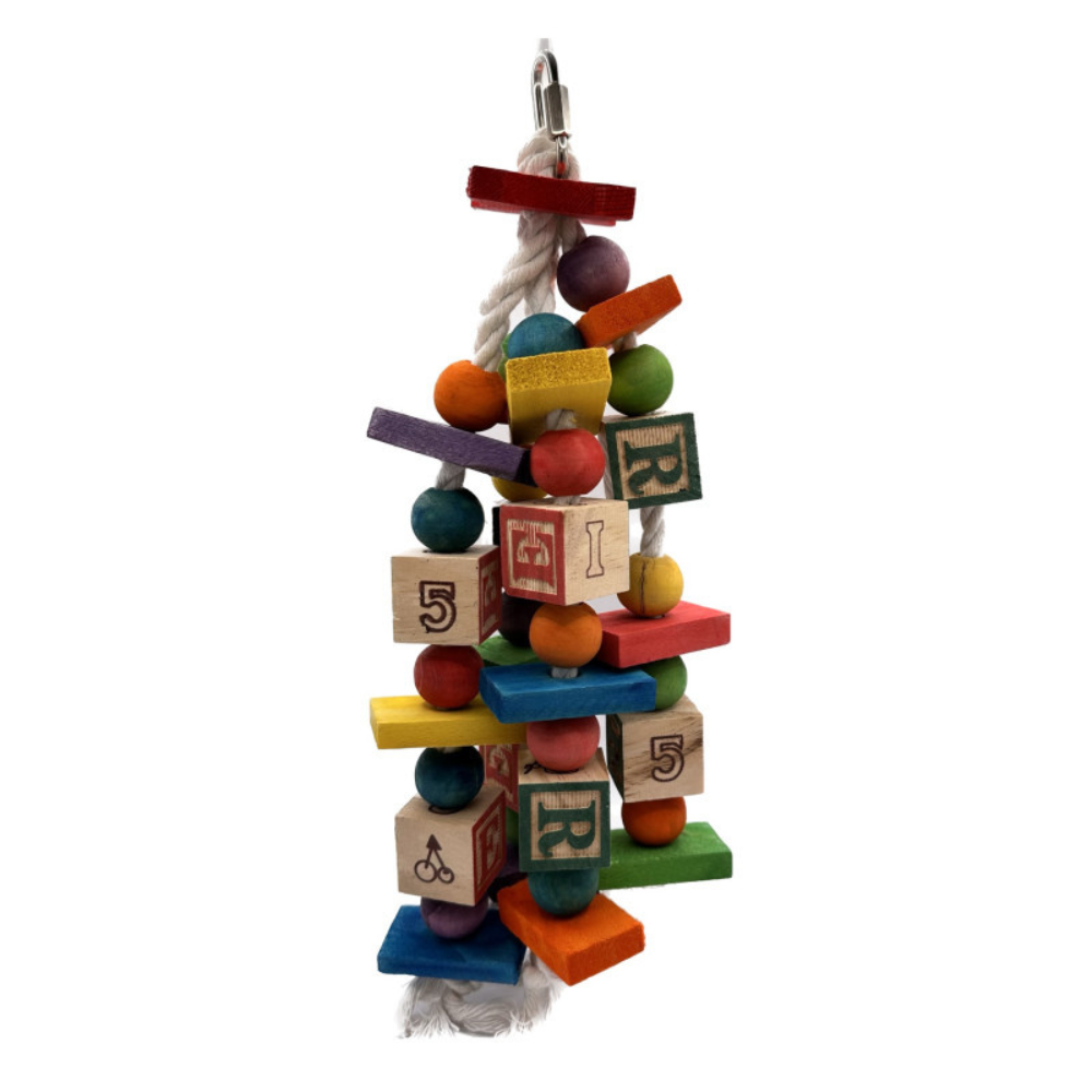 Juguete hecho con piezas y cubos de madera de distintos colores. Estos juguetes son ideales para loros medianos y grandes como amazonas, guacamayos, cacatúas, yacos, etc.