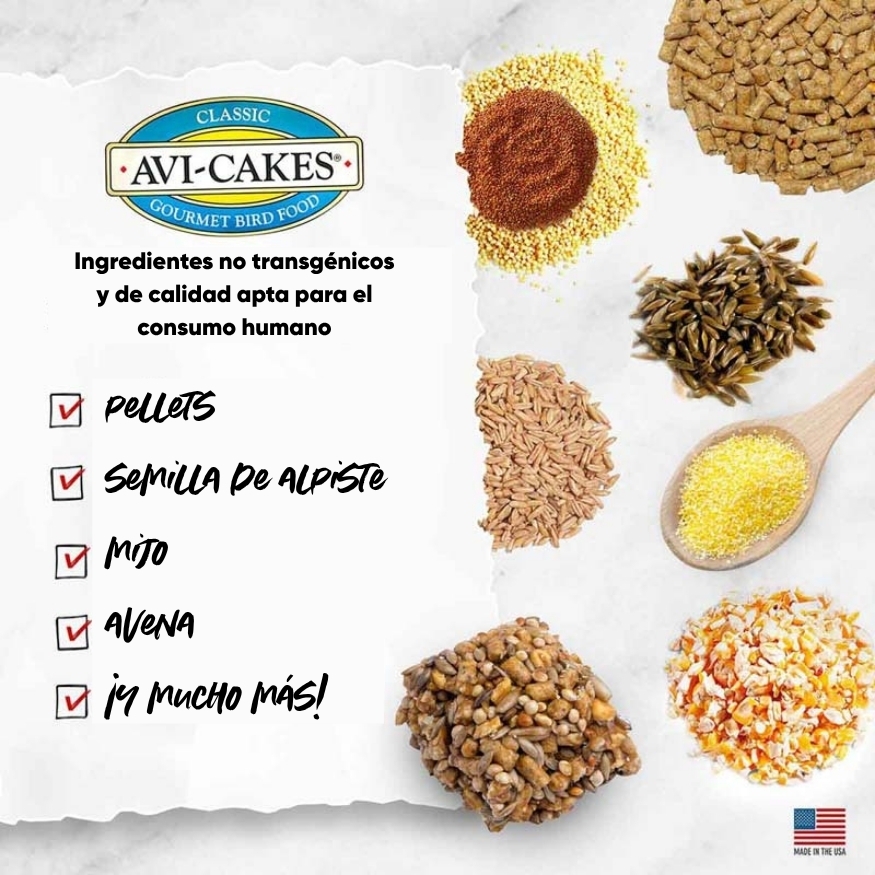 Lafeber Avi-Cakes son perfectos para ayudar a tu ave a adaptarse a un nuevo tipo de alimentación, ya sea del pellet a la semilla o viceversa. La combinación de texturas hace que esta comida sea atractiva para aves que necesitan variedad en su dieta.