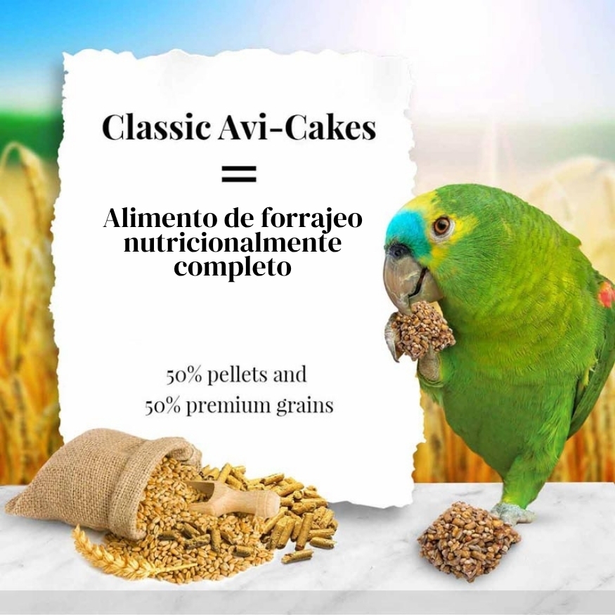 Guía de alimentación: Ofrece Avi-Cakes frescos a diario, junto con agua limpia y fresca. Suministra la cantidad que creas que tu ave comerá en un plazo de 12 horas. Se recomienda complementar la dieta con hasta un 20% de frutas y verduras frescas. También puede ofrecerse como premio o golosina.