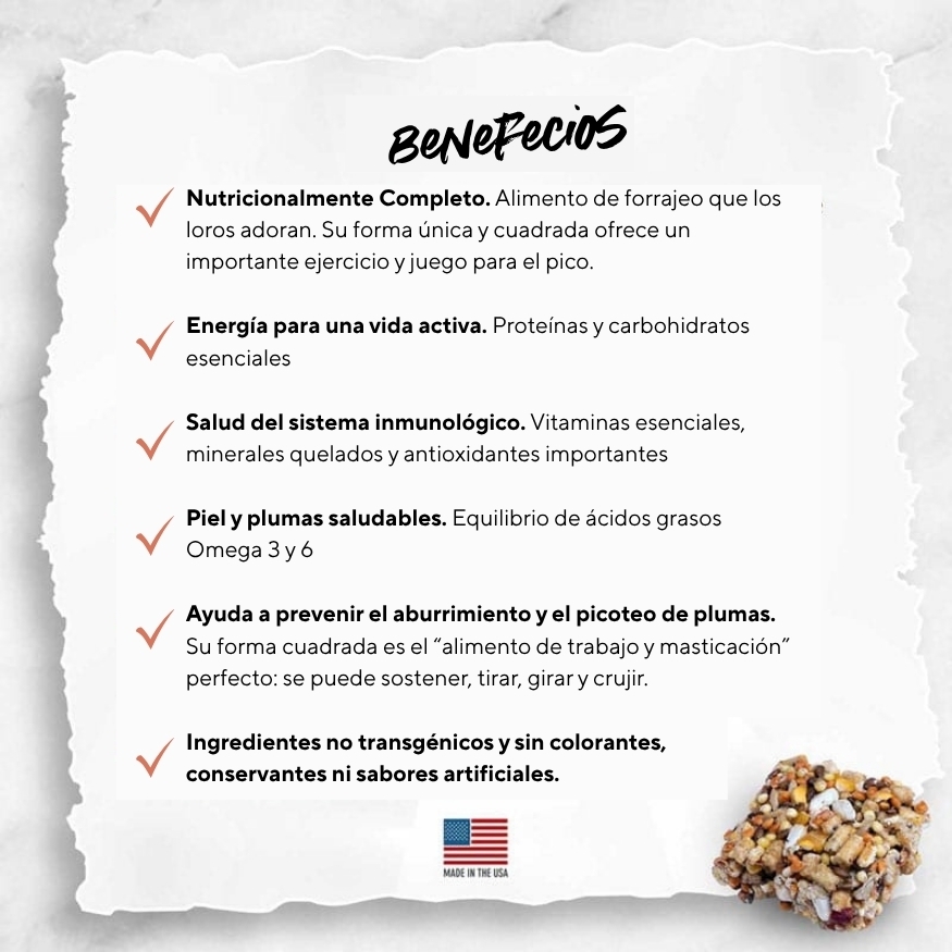 Cada bocado contiene una mezcla equilibrada de proteínas, carbohidratos, ácidos grasos omega 3 y 6, y vitaminas que favorecen una piel sana, un plumaje brillante y un sistema inmunológico fuerte. Esta golosina nutritiva no contiene colorantes, conservantes ni saborizantes artificiales, y está elaborada con ingredientes de calidad apta para el consumo humano.